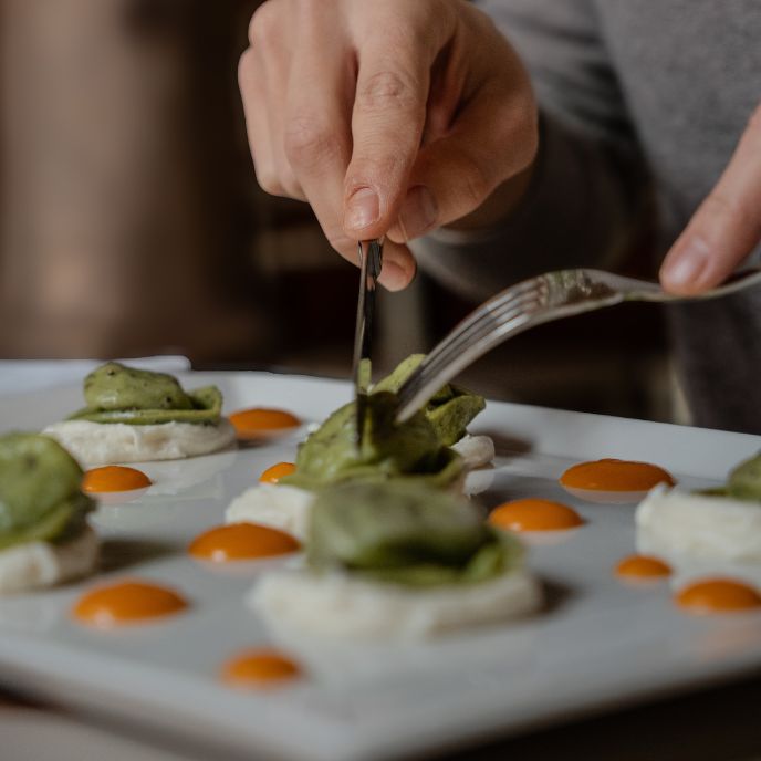 La nostra cucina unisce tradizione marchigiana e influenze contemporanee, con piatti che valorizzano ingredienti locali attraverso tecnica, creatività ed equilibrio. Il tutto in un ambiente elegante, impreziosito da suggestive grottesche settecentesche che rendono ogni cena un momento speciale.